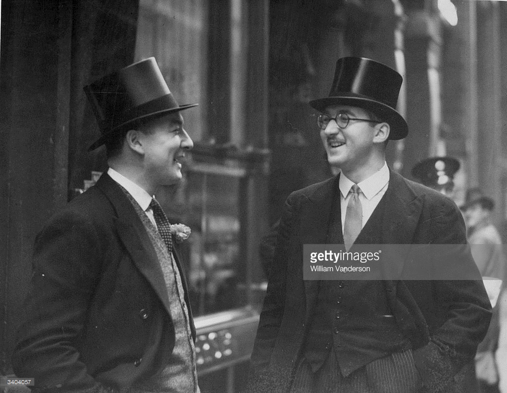 Le due foto allegate mi danno la possibilità di qualche riflessione sull'evoluzione dell'abbigliamento classico maschile in relazione al loro ambito d'uso. La prima risalente al 1939, allegata anche come copertina, ritrae due businessmen mentre discutono allegramente nei pressi del London Stock Exchange. Entrambi indossano abiti formali da mattina con giacca nera, gilet sottogiacca e pantaloni a righe associati ad un cilindro nero (due stroller suits con revers a lancia di cui uno a doppio petto ed un altro monopetto ). Il colore di questo copricapo ci rivela il dress code che ne sottende l' uso: il mondo degli affari anche di mattina ammette solo il nero (black top hat) a differenza del colore grigio (gray top hat) idoneo per matrimoni da mattina o per assistere ad eventi sportivi quali le corse ad Ascot. La strettissima annodatura delle cravatte, impreziosita al di sotto del nodo da fossette (“dimples”) perfette, sembra svelare la presenza in entrambi personaggi di doti quali sicurezza ed autorevolezza, indispensabili ad un uomo d'affari. A differenza del gentiluomo di destra, il cui gilet è dello stesso tessuto della giacca, quello di sinistra indossa non un classico gilet in tessuto ma un gilet grigio in lana, riconoscibile come tale sia per la particolare lunghezza che per la maggiore spaziatura dei bottoni. Quest'ultimo particolare, permette alcune considerazioni di tipo storico: i) come documentato da immagini fotografiche e da fashion sketchs, apparsi su Apparel Arts ed Esquire di quel periodo, l'introduzione di un gilet sottogiacca in lana al posto del classico gilet in stoffa incomincia ad osservarsi nel contesto urbano del West End londinese intorno al 1937 in associazione ad abiti da mattina realizzati principalmente con tessuti definiti “semi-sports” (in quanto adatti sia per la campagna che per le occasioni informali in città) (vedi al Castello gli Appunti n° 6284 e 3112 del Taccuino dell'Abbigliamento); ii) gilet in lana,come quello presente nell'immagine, rappresentano una variante rarissima dei gia' rari gilet in jersey, talvolta osservabili al disotto di giacche da stroller o di morning coats.