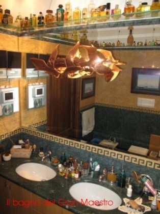 Sul lavabo vi saranno dei contenitori con il necessario per la rasatura della barba oltre che il sapone per le mani alloggiato nell’apposito portasapone. I contenitori per il sapone da barba oltre che il vaporizzatore per il dopobarba saranno in vetro con i tappi e gli accessori in acciaio cromato. Tali prodotti normalmente sono in vendita in contenitori di cartone contenenti boccette o vasetti con etichette reclamizzanti il contenuto e come tali poco adatti a figurare nel bagno dell’uomo elegante. Egli infatti, dopo averli acquistati provvederà a travasarli nei propri contenitori in vetro ed acciaio come sopra descritti. Vi sono contenitori con chiusure in argento od argentate, non brutte a vedersi sinché son perfettamente lucide; personalmente trovo che l’acciaio sia più igienico e più virile e, quindi, come tale, più adatto ad un gentiluomo.