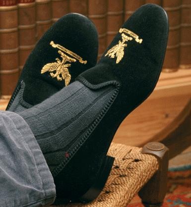 Le scarpe da casa sono delle calzature specifiche per l’uso domestico. Normalmente sono in velluto, ma ve ne sono anche di morbidissima pelle; non hanno né mascherina né puntale e la tomaia copre anche i quarti laterali. Sono assolutamente accollate. I colori preferibili sono il bleu, il rosso, il nero, il verde, tutti nella tonalità scura. La suola, usualmente è in cuoio molto sottile, il tacco è più basso di quelli normali da uomo ed è particolarmente leggero. Alcune volte il gentiluomo fa ricamare sulla tomaia un motivo decorativo; ne ho viste alcune con il monogramma o, addirittura, con lo scudo araldico; personalmente non trovo che la tomaia delle scarpe sia il luogo più appropriato a ciò, personalmente le preferisco lisce. Egli, dopo aver calzato le proprie scarpe da casa, sceglierà la cravatta – nella propria casa non dovrebbe aver necessità di fazzoletto da collo a meno che non sia influenzato – ed indosserà la giacca da camera.
