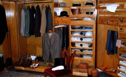Negli appartamenti moderni, in cui le ridotte dimensioni degli ambienti condizionano la vita di chi vi abita, saranno necessari armadi guardaroba a doppia altezza; chi non avesse vincoli di spazio propenderà per armadi in legno senza sopralzi, sempre difficili da raggiungere. Il gentiluomo avrà un armadio per ogni tipologia di vestito: da quelli invernali a quelli estivi; i vestiti da cerimonia, viceversa, potranno esser riposti in un unico armadio. Le camicie troveranno collocazione, possibilmente verticale, in modo da evitare segni dovuti alla piegatura necessaria per l’alloggiamento in orizzontale. I cassetti saranno riservati a pullover, guanti e quant’altro, i cappelli troveranno collocazione in un armadio suddiviso con ripiani. Per la conservazione delle cravatte opterei per gli appositi gancetti all’interno delle ante degli armadi trovando che il posizionamento steso od arrotolato nei cassetti non giovi alle stesse. In un armadio separato troveranno collocazione le scarpe e gli stivali. Nella stessa stanza, ove non ve ne siano d’altre specifiche, potranno trovare alloggio borse e valige da viaggio. Non sarà superflua un piccola cassaforte nascosta ove riporre gemelli di pregio, fermacravatta, orologi preziosi ed oggetti di valore d’uso quotidiano. Della collocazione della biancheria intima si parlerà descrivendo la camera da letto.