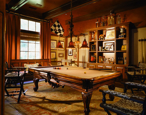 Il gentiluomo abitualmente si compiacerà d’intrattenersi con gli amici più cari per conversare od anche per dilettarsi nel gioco delle carte o degli scacchi. La dimora dell’uomo elegante dovrebbe sempre prevedere dei luoghi in cui poter coltivare tali passatempi. Un locale da dedicare a tutto ciò, magari segnato da un gran biliardo centrale, sarebbe l’ideale. In mancanza, un angolo del soggiorno potrebbe costituire un accettabile alternativa. Una lampada da gioco basterà a creare l’atmosfera, perché in mancanza di grandi superfici è modificando l’illuminazione che si passa da una destinazione all’altra e si ottiene una diversità di ambienti in uno solo. Chi invece potesse dedicare un ambiente destinato a tali svaghi, prevederà sicuramente la presenza d’un camino vicino al quale siano collocate, preferibilmente, comode poltrone e divani per accogliere gli amici fraterni con cui abbandonarsi in amabili conversazioni. In un angolo non potrà mancare un tavolino per il gioco delle carte. Ve ne sono alcuni con i piani in legno intarsiato che, aprendosi, rivelano un quadrato di pelle verde intorno al quale cimentarsi con gli amici in dilettevoli partite di carte. Un uomo elegante preferirà tali tavolini a quelli il cui piano in panno o pelle verde immediatamente s’offre alla vista. Questi infatti rimandano immediatamente il pensiero alle case da gioco ed un gentiluomo non permetterà mai che la sua dimora possa essere confusa con un casinò. Un salottino atto ad ospitare le Dame dei gentiluomini che conversino o siano impegnati nel gioco, sarà il giusto completamento per questo tipo di sala. Essendo questo ambiente dedicato ai piacevoli passatempi, potrà giovarsi di colori vivaci sia per i muri che per le tappezzerie e i tendaggi.