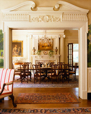Da questo salottino si accederà alla sala da pranzo. Vi sono case in cui ve ne sono due, una per l’uso quotidiano ed una per le occasioni più formali. Personalmente non concordo con ciò, il gentiluomo non desina in modo più o meno formale: egli è sempre sé stesso, pertanto o che sia solo, con la sua Dama, o con numerosi ospiti per un pranzo di gala, siederà nella medesima sala da pranzo. Qui saranno collocati mobili atti a conservare i servizi da tavola in porcellana, in argento, in sheffield, in ottone con placcatura argento, mai in acciaio. Di quest’ultimo metallo sono solo la coltelleria e la posateria da cucina. E’ bello vedere la posateria da tavola con incise le iniziali dei padroni di casa o, per chi avesse servizi di famiglia, con quelle dei propri antenati. Anche lo stemma inciso è permesso. Trovo però che, ove sia possibile, è assolutamente più bello e ricco far rappresentare le iniziali o lo stemma a sbalzo. Particolare attenzione dovrà essere fatta alla quadreria di questa sala. I dipinti, meglio se ad olio, rappresenteranno nature morte con selvaggina, con frutta, divinità ed amorini che banchettano, dejeuner sur l’erbe ed altri soggetti similari. Sono consentite vedute di paesaggi, ma sempre amene. E’ auspicabile che si vogliano evitare vedute di architetture classiche, ruderi ed ancor peggio tempeste, navi in mari burrascosi e consimili che mal s’accompagnano al desinare. I quadri degli antenati saranno collocati in altri ambienti come si vedrà appresso, quelli di soggetto religioso troveranno appropriato luogo nella cappella o nelle camere da letto: il ristoro dello spirito non c’entra nulla con il ristoro dello stomaco. Dei tovagliati, del servizio di tavola, delle suppellettili di questa stanza, del convitato di pietra e di quant’altro attinente ai pasti, si dirà nel capitolo dedicato al pranzo serale nel titolo "Le relazioni sociali del gentiluomo".