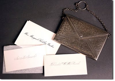 Addentriamoci ora ad esaminare un altro degli strumenti del corredo cartaceo d’un gentiluomo: i biglietti di visita. Il loro nome nasconde lo scopo per cui essi nacquero: erano dei piccoli foglietti di carta leggermente spessa sul quale era scritto il nome e cognome del proprietario e venivano porti al valletto che apriva la porta quando ci si recava, per l’appunto, "in visita". Erano d’una dimensione tale da poter esser riposti dal gentiluomo nel taschino del panciotto.