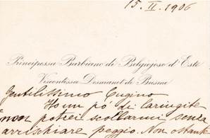 Anche per questo tipo di biglietti credo che la scelta d’un cartoncino bianco con una stampa blu scuro o nero sia l’ideale; quanto al carattere si può propendere per lo stampatello. Andiamo, ora ad esaminare i biglietti per la piccola corrispondenza. Essi sono, ovviamente, per uso strettamente personale e, pertanto, varranno le stesse regole di quelli personali da taschino, sia per la carta, sia per il carattere da usarsi per la stampa, che per il colore. Su questi biglietti si scrive qualche riga. Solo che per questi è consentito, per aver un po’ più di spazio per lo scritto, che il nome ed il cognome, ove del caso corona di grado e predicato, possano essere collocati, invece che al centro, in alto a sinistra o vi si faccia imprimere a secco al loro posto il proprio scudo, nobiliare o non nobiliare, possibilmente mai entrambi.