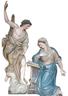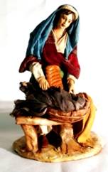viene, solitamente, raffigurata seduta, con il Bambino in grembo, o inginocchiata in adorazione; la veste è color rosa, il manto celeste ed il velo bianco. San Giuseppe ha la tunica color lilla ed il mantello giallo.