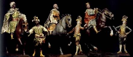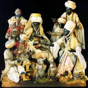 Un’altra scena che non dovrebbe mancare nel presepe è il corteo dei Magi. Essi possono rappresentare o le tre differenti razze: la semitica, la giapetica e la camita, o le diverse età dell’uomo; Melchiorre è l’uomo anziano, Baldassarre, l’adulto e Gaspare il più giovane. In ogni caso essi portano dei doni. La mirra, portata da Gaspare, il re delle Indie, nell’uso sacrale, come l’olio, d’altronde, veniva creduta carica d’una forza magica e, pertanto, si usava, nell’antichità, per "ungere" i re; il vocabolo Messiah, difatti, significa l’Unto. L’incenso, portato da Baldassarre, il re arabo moro, è una resina odorosa: bruciare incenso aveva ed ha, tuttora, il significato di adorare. L’oro, portato da Melchiorre, il re persiano, è il metallo più nobile e, quindi, degno d’un Dio; è contenuto in un sfera che simboleggia il mondo.
