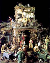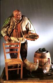 La statuina del diavolo, però, raffigurato incatenato e dal volto truce, si usa collocarla nei pressi della natività. Nell’osteria siedono avventori, tra cui spiccano spesso giocatori di carte.