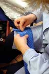 La cravatta di Marinella è imitabile, ma non riproducibile. Per farlo, bisognerebbe essere un Maurizio Marinella e questo, consentitemi, non è possibile. Quasi ogni cravatta passa per le sue stesse mani e tutti chiedono di lui. Era così quando si andava ad acquistare avana a Rue de Rive, aspettando di essere serviti da Zino Davidoff. Pur servendo una clientela sterminata, Maurizio conserva e accontenta puntigliosamente un nucleo di persone veramente esigente, che rispetta i tempi di attesa per un prodotto su misura. A pochi passi dal negozio, in Via Vannella Gaetani n. 27, sorge infatti un laboratorio dedicato esclusivamente a coloro che ordinano cravatte su misura. Questo locale non ha accesso dalla strada, ma è arredato e accogliente. Vi lavorano solo donne, ognuna ad un banco di lavoro dove si realizza una delle fasi di lavoro. Chi desidera una cravatta più lunga o più corta, più larga o cucita diversamente, chi vuole scegliere il tessuto con gran calma o anche solo imparare come si lavori la cravatta, chieda direttamente a Maurizio - o, nei rari casi di sua assenza, a qualcuno dei suoi collaboratori - di visitare questo laboratorio. Vi ci accompagnerà personalmente. Infatti è proprio a questa clientela ristretta ed esigente, che altri riterrebbero improduttiva, che egli non esita da sempre a destinare le migliori risorse di tempo e di spazio. Qui l' appassionato può seguire tutta la produzione e creare la propria cravatta secondo un disciplinare personale, che viene poi conservato in una scheda. Questo atteggiamento consente di mantenere un nucleo di cultura e di necessità personali e personalizzate che non vanno discusse, ma assecondate e alimentate.